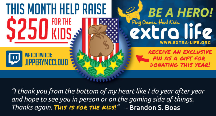 As he’s done for the last couple of years, Brandon will be representing the Johns Hopkins Children’s Center of Baltimore, Maryland. If you are able to make any donations or contributions, feel free to visit his gamer page, Jippery McCloud Gaming or go directly to his Extra Life donation page.