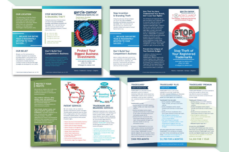 Garcia-Zamor Intellectual Property LawGraphic Design For this intellectual property law office we’ve created branded marketing materials for them such as brochures, flyers, client packets, and holiday greetings. We’ve been working with their pre-established brand to make new materials which they use to attract new clients and promote their services.
