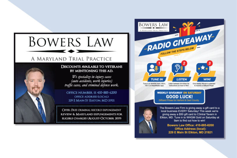 Bowers LawGraphic Design For this Maryland law office we’ve created a few print and digital ads to help promote their services. These ads are meant to be bold and eye catching in their respective publication and social media settings.