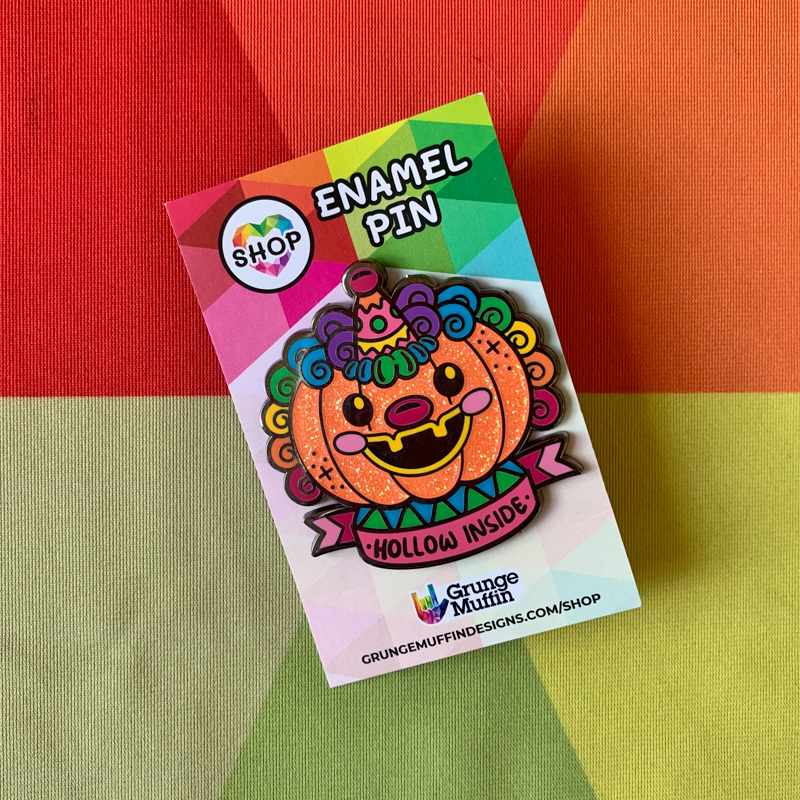 Deluxe Hard Enamel Pin featuring my “Hollow Inside” or “Pumpkin Clown” design. This pin design was originally released as one of the October 2022 pins for the GMD Pin Club.