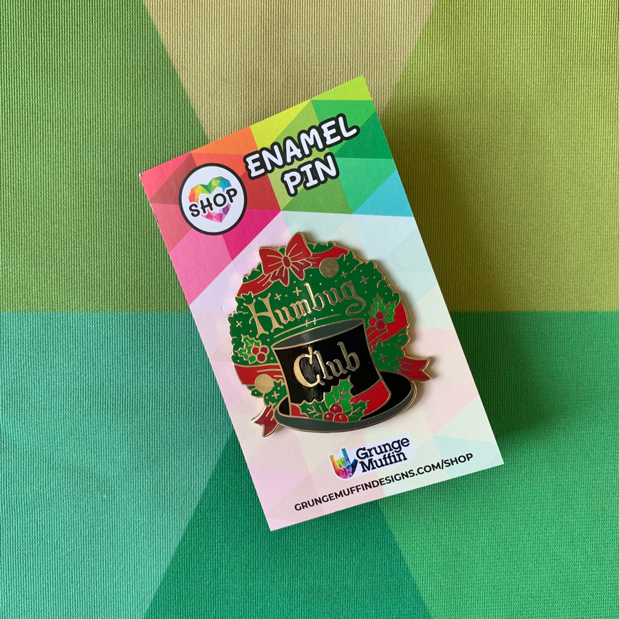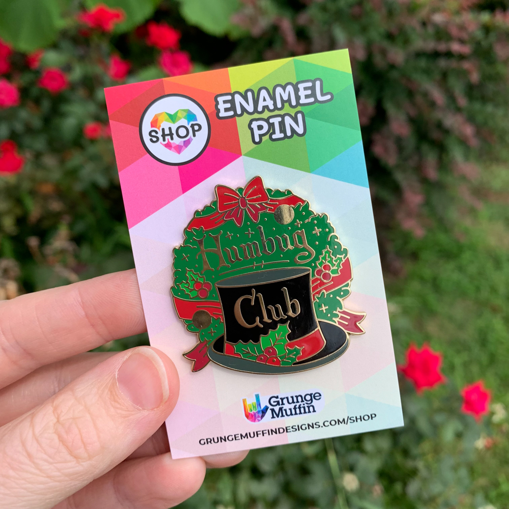 Deluxe Hard Enamel Pin featuring my “Humbug Club” or “Dickens of a Christmas” design. This pin design was originally released as one of the December 2022 pins for the GMD Pin Club.
