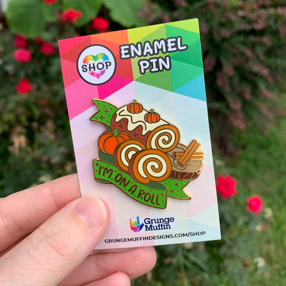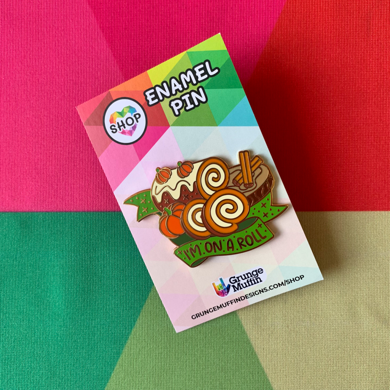 Deluxe Hard Enamel Pin featuring my “I’m On A Roll” or “Pumpkin Roll” design. This pin design was originally released as one of the November 2022 pins for the GMD Pin Club.